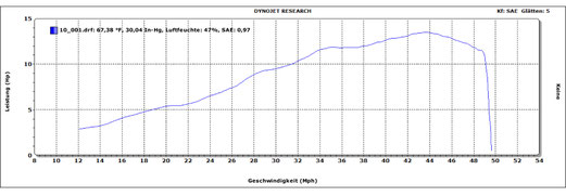 13,5 PS waren es auf dem Leistungsprüfstand am Hinterrad, das sind immerhin ca. 6 PS mehr als die Serie .