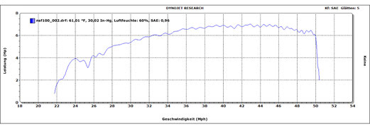 Leistung laut Messung am Hinterrad : 7,28 PS ( 5,4 kW ) / 8.000 U/Min.